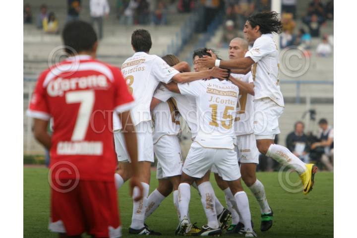 MÉXICO, D.F., 25JULIO2010.- Jugadores de los Pumas de la UNAM festejan la segunda anotación realizada por Luis Fuentes durante el partido en contra de los Diablos Rojos del Toluca en la fecha 1 de Apertura 2010 en el Estadio de Ciudad Universitaria en el que los Pumas de la UNAM vencieron con un marcador de 2 -1. FOTO: LUZ ACEVEDO/CUARTOSCURO.COM