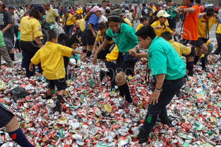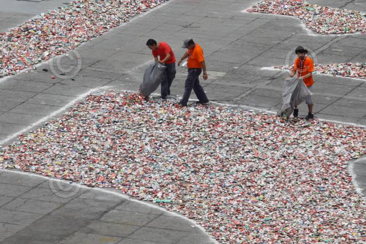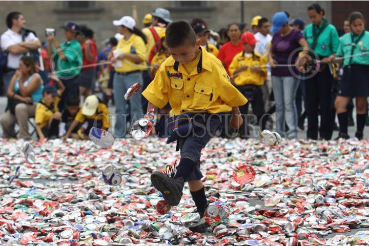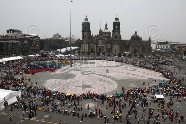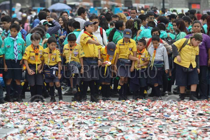 MÉXICO, D.F., 29AGOSTO2010.- Cientos de Scouts intentaron romper el récord de la Flor de Lis más grande del mundo realizada con miles de latas de aluminio en la plancha del Zócalo capitalino durante la clausura del evento con el que se conmemoran los 84 años de su asociación. FOTO: RODOLFO ANGULO/CUARTOSCURO.COM