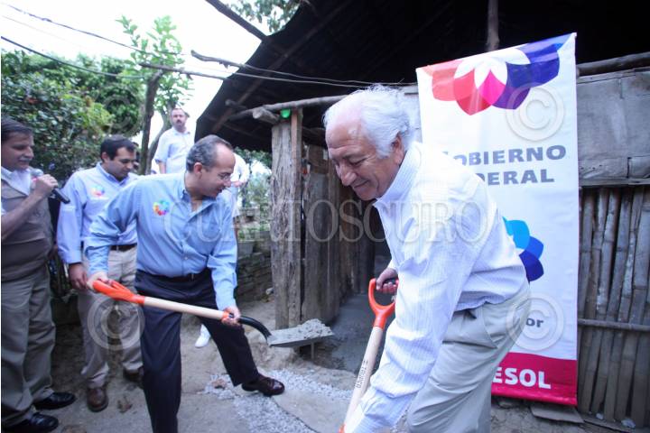 HUEHUETLAN, SAN LUIS POTOSI, 12MARZO2009.- Felipe Calderón, Presidente de México, durante el evento 1939 Acción de piso firme realizadas para vivir mejor. FOTO: ALFREDO GUERRERO/CUARTOSCURO.COM