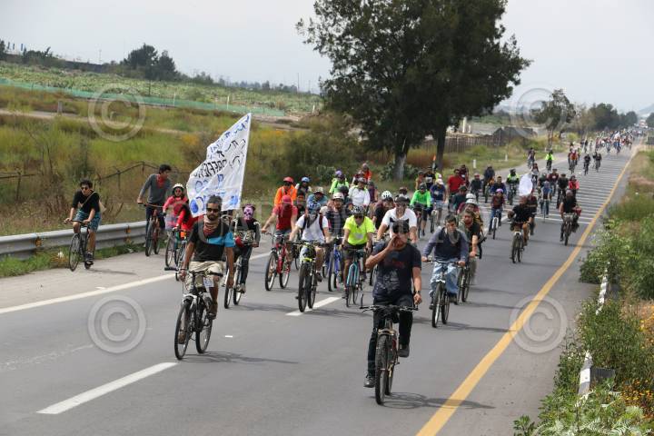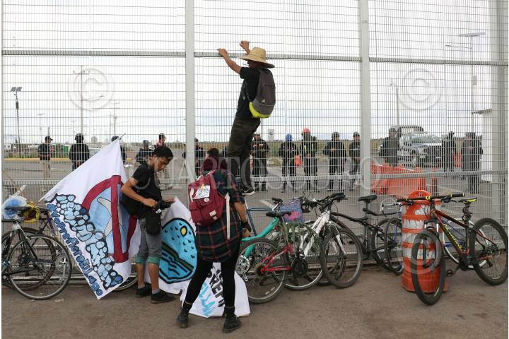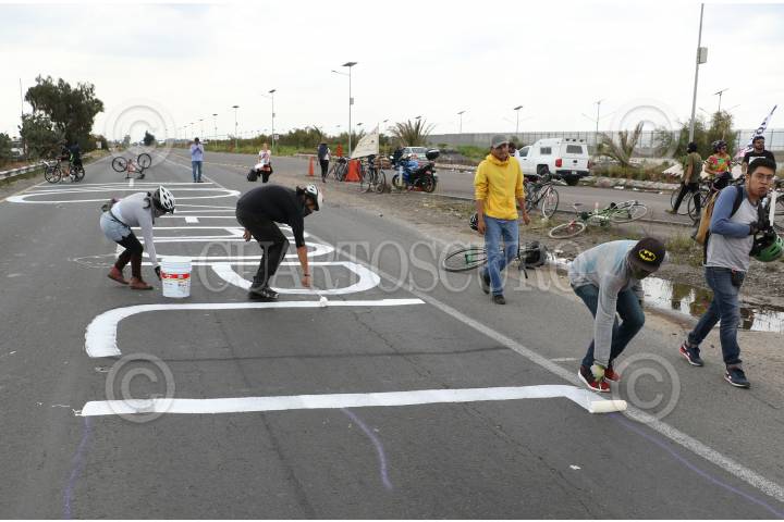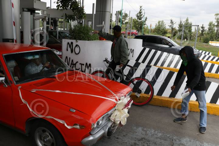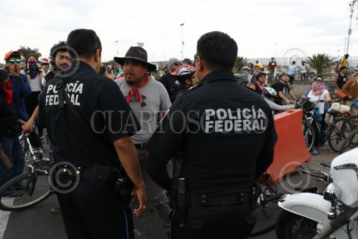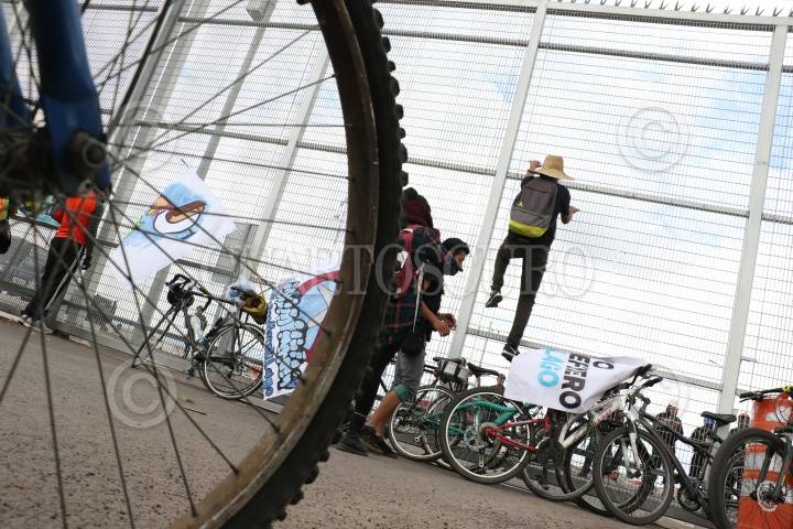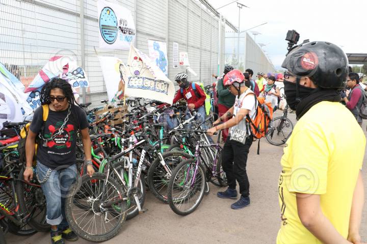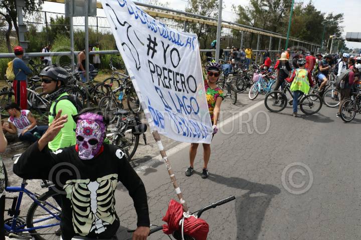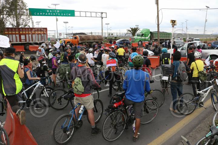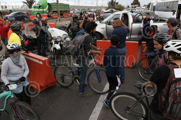 TEXCOCO, ESTADO DE MÉXICO, 20OCTUBRE2018.- Decenas de jóvenes en bicicletas participaron en la rodada "Bicis Vs Aviones" que partio del monumento a la revolución hacia la puerta 7 del nuevo aeropuerto Internacional de la Ciudad de México. Los inconformes tomaron por algunos minutos la caseta Peñon-Texcoco y bloquearon la autopista para exigir que paren las obras debido a que es un ecocidio que provocaría la extinción del lago de Texcoco. FOTO: SAÚL LÓPEZ /CUARTOSCURO.COM