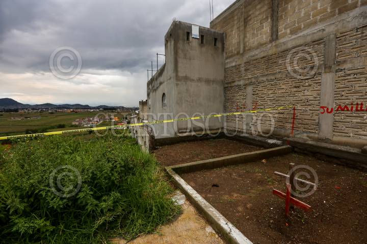 Parte de la barda perimetral del panteón de San Francisco Tlalcilalcalpan se colapsó debido al reblandecimiento de la tierra por las lluvias de las últimas horas.