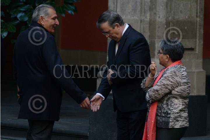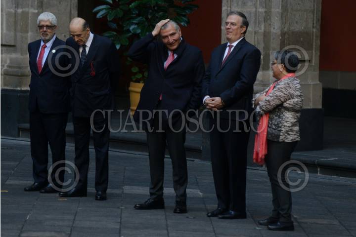 Adán Augusto, secretario de Gobernación; Marcelo Ebrard, secretario de Relaciones Exteriores, y Raquel Buenrostro, secretaria de Economía, durante la ceremonia de recepción en Palacio Nacional a Gustavo Francisco Petro, presidente de la República de Colombia.