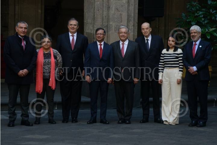 Germán Umaña, ministro de Comercio, Industria y Turismo de Colombia; Álvaro Leyva, ministro de Relaciones Exteriores de Colombia; Adán Augusto, secretario de Gobernación; Marcelo Ebrard, secretario de Relaciones Exteriores, y Raquel Buenrostro, secretaria de Economía, durante la ceremonia de recepción en Palacio Nacional a Gustavo Francisco Petro, presidente de la República de Colombia.