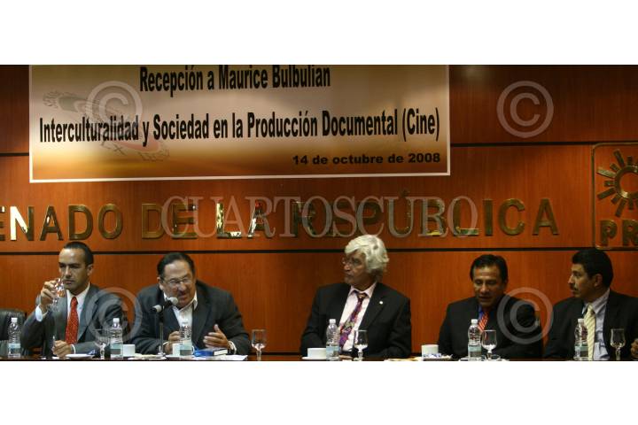 MÉXICO D.F., 14OCTUBRE2008.-El cineasta Maurice Bulbulian fué recibido por legisladores perredistas en torre del caballito, lo acompañan el Dpiputado Erik Lopez, Julio Moguel y los senadores perredistas José Luis García y Lázaro Mazón. FOTO: SÁSHENKA GUTIÉRREZ /CUARTOSCURO.COM
