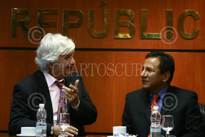 MÉXICO D.F., 14OCTUBRE2008.-El cineasta Maurice Bulbulian conversa con el senador Lázaro Mazon en el piso 27 de la torre del Caballito donde fué recibido por legisladores perredistas . FOTO: SÁSHENKA GUTIÉRREZ /CUARTOSCURO.COM