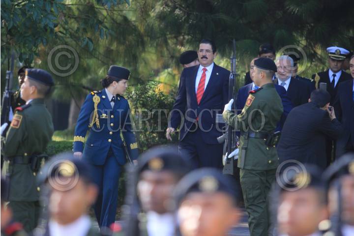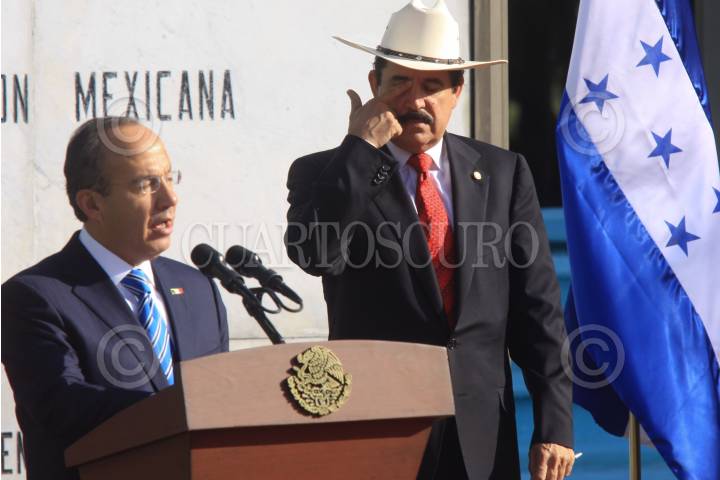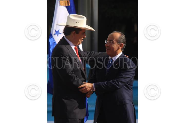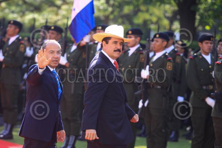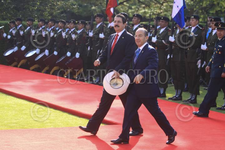 MÉXICO, D.F., 04AGOSTO2009.- El presidente de Honduras, Manuel Zelayafué recibido con todos los honores por el mandatario mexicano Felipe Calderon Hinojosa en la explanada Francisco Madero , de la residencia oficial de los pinos FOTO: SÁSHENKA GUTIERREZ/CUARTOSCURO.COM
