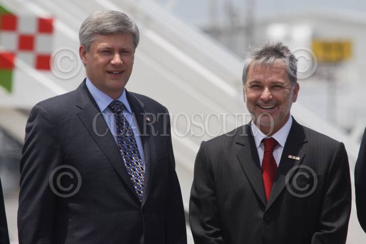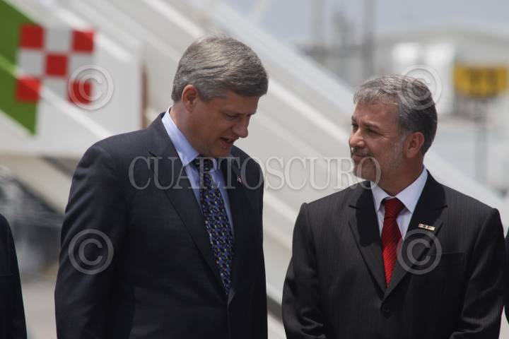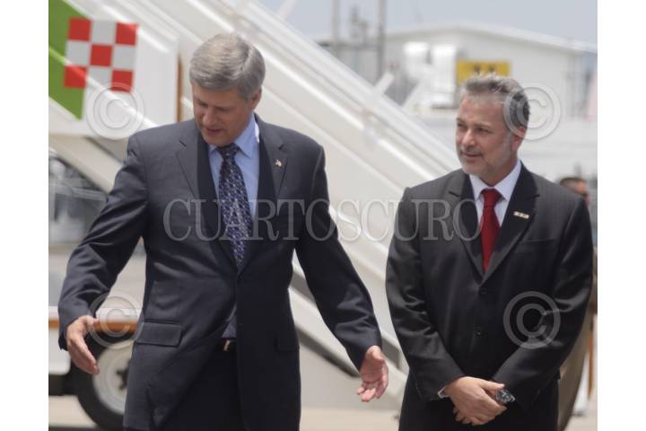 GUADALAJARA, JALISCO 09 AGOSTO 2009.- El primer ministro de Canadá, Stephen Harper a su arrivo al aeropuerto Miguel Hidalgo donde fue recibido por el gobernador del estado Emilio Gonzalez Marquez mas tarde el ministro se reunira con los presidentes Felipe Calderón y su homólogo de EU, Barack Obama en La Cumbre de Líderes de América del Norte y FOTO: SÁSHENKA GUTIERREZ/CUARTOSCURO.COM