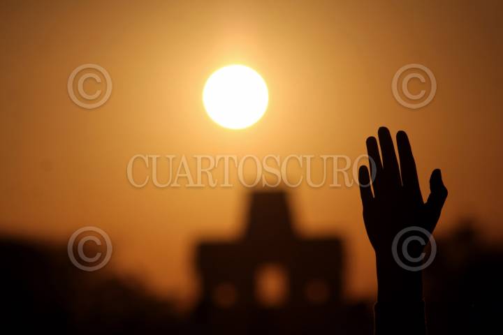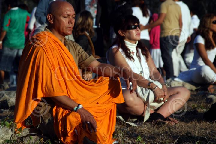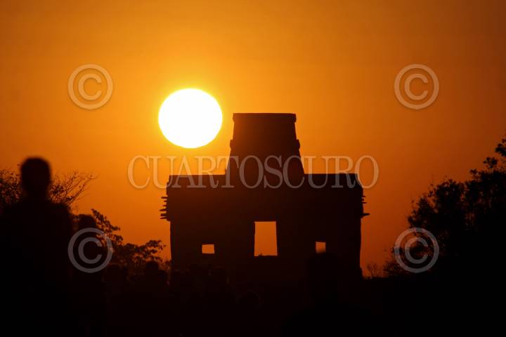MÉRIDA, YUCATÁN, 21MARZO2011.- Más de seis mil personas acudieron a la zona arqueológica Dzibilchaltún para recibir la primavera frente al majestuoso templo de las siete muñecas, a las seis horas con diez minutos de este lunes el sol hizo su aparición aunque no logro encuadrar en el pasillo principal de la pirámide; los visitantes realizaron meditaciones y extendieron los brazos en señal de bienvenida y para cargarse de energía. FOTO: FRANCISCO BALDERAS/CUARTOSCURO.COM