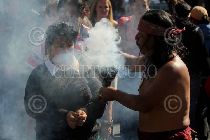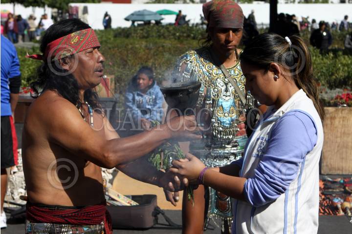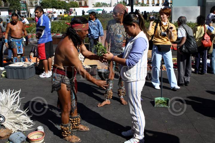 MEXICO, D.F., 31DICIEMBRE2010.- Curanderos prehispánicos ofrecen una limpia de cuerpo y espíritu contra las malas vibras y para recibir las buenas vibras para el 2011. Con manojos de hierbas, una humeada con copal y una oración a los dioses prehispánicos los capitalinos terminan el año 2010 en el Zócalo. FOTO: RODOLFO ANGULO/CUARTOSCURO.COM
