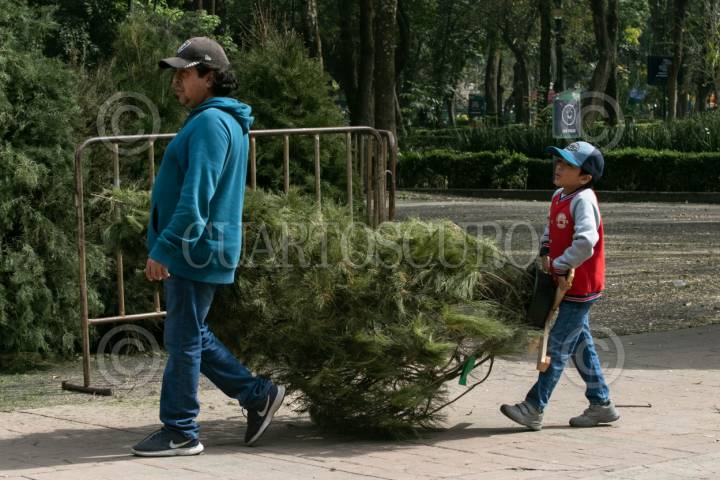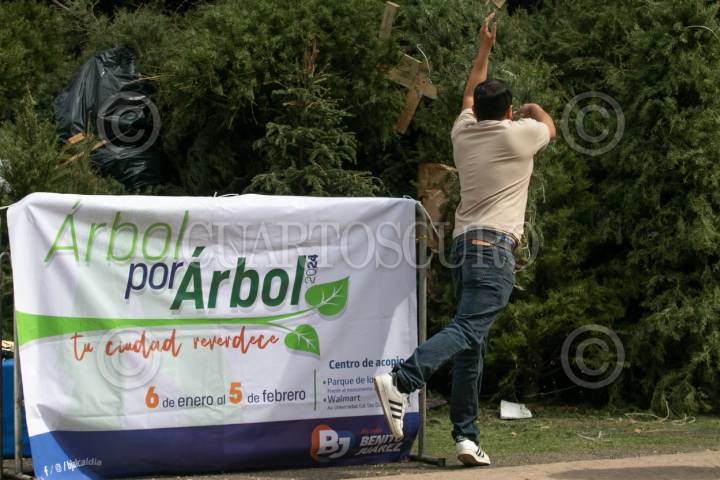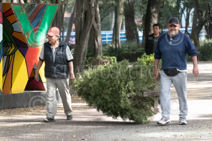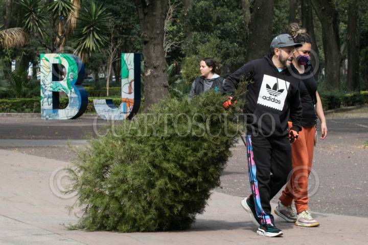 CIUDAD DE MÉXICO, 07ENERO2024.- Gran convocatoria esta teniendo la campaña "Árbol por Árbol 2024" en el Parque de los Venados, decenas de capitalinos acuden con sus árboles de navidad tras concluir el período navideño, a cambio obtienen un árbol para trasplantar y así poder contribuir al medio ambiente. Los árboles recolectados serán utilizados para realizar composta biodegradable. FOTO: MOISÉS PABLO/CUARTOSCURO.COM