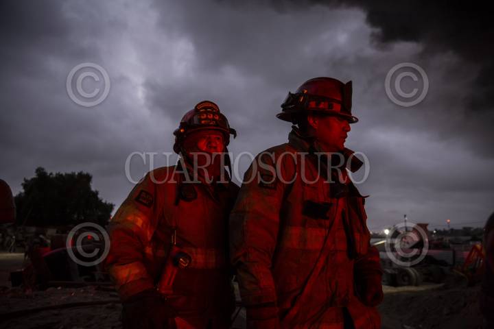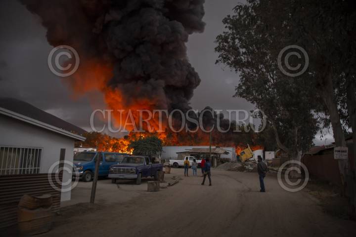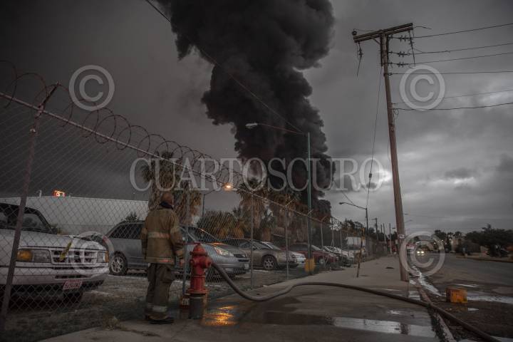 Bomberos trabajando en el incendio en la fabrica "Reciclados BC" en Tijuana.