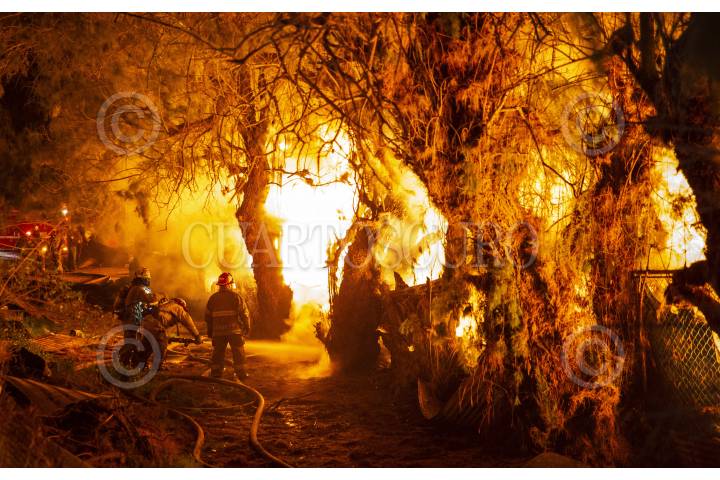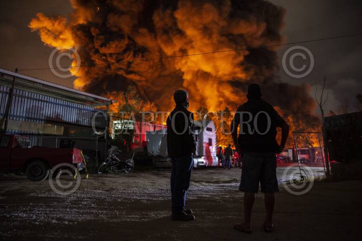Bomberos tratando de sofocar las llamas de fuego del incendio con mangueras de agua en la fabrica "Reciclados BC" en Tijuana.