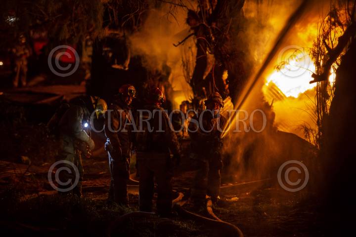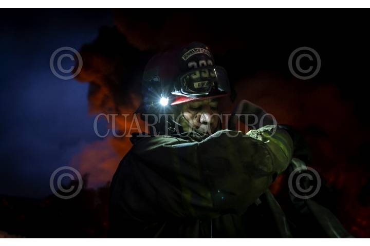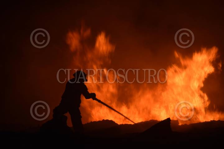 Bombero tratando de sofocar las llamas de fuego del incendio en la fabrica "Reciclados BC" en Tijuana.