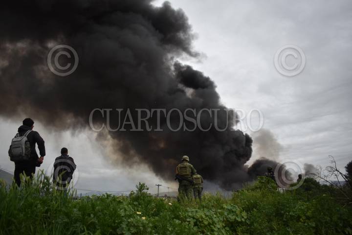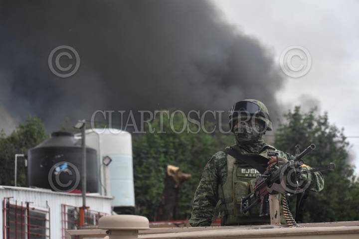 Militar del Ejercito Mexicano resguardando el lugar, con columnas de humo de fondo.