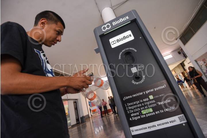 TOLUCA, ESTADO DE MÉXICO, 07MAYO2025.- Se instala en Toluca la primera máquina inteligente de reciclaje, ubicada en la Concha Acústica. Los usuarios recibirán recompensas al momento de reciclar sus envases, esto como una forma de reducir el impacto ambiental, promover la economía circular e impulsar la instalación de más máquinas reguladoras; estas funcionan a través de una aplicación que se descarga en el celular y guía al usuario para hacer su reciclaje sencillo. FOTO: CRISANTA ESPINOSA AGUILAR /CUARTOSCURO.COM