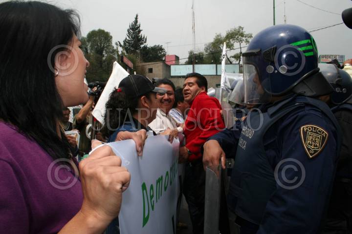 MÉXICO, D.F. 4AGOSTO2006.- Integrantes del grupo "El Barzón" marchó hacia la Recidencia Oficial de los Pinos. Hubo un ligero enfrentamiento al intental pasar sobre la barrera de granaderos que resguardaban el lugar. FOTO: Paola Hidalgo/CUARTOSCURO.COM