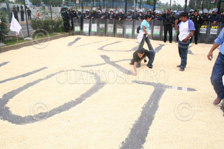MÉXICO, D.F. 4AGOSTO2006.- Integrantes del grupo "El Barzón" marchó hacia la Recidencia Oficial de los Pinos. Descargaron costales de maíz, este producto fué arrojado hacia los granaderos que resguardaban el lugar. Un campesino patea maíz a las botas de los guardias. FOTO: Paola Hidalgo/CUARTOSCURO.COM