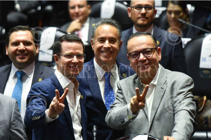 CIUDAD DE MÉXICO, 01SEPTIEMBRE2024.- , Los legisladores priístas: Rubén Moreira, Alejandro Moreno Cárdenas, Carolina Viggiano, y Manuel Añorve, durante la Sesión de Congreso General para la apertura del primer periodo de sesiones ordinarias del primer año de ejercicio de la LXVI Legislatura del Congreso de la Unión realizada en el salón de pleno de la Cámara de Diputados. FOTO: MARIO JASSO/CUARTOSCURO.COM