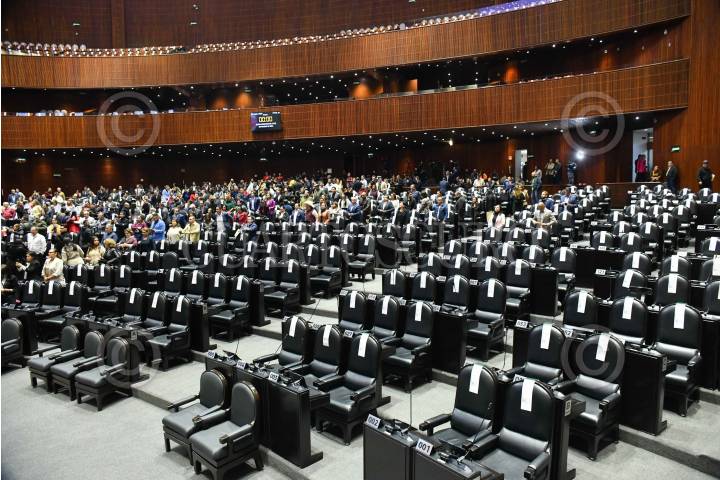 CIUDAD DE MÉXICO, 29SEPTIEMBRE2024.- Curules vacíos de legisladores de los grupos parlamentarios: PAN y PRI durante sesión la ordinaria de la LXVI Legislatura de la Cámara de Diputados en la que se dio lectura a la declaratoria de publicidad al dictamen de reforma al Poder Judicial. FOTO: MARIO JASSO/CUARTOSCURO.COM