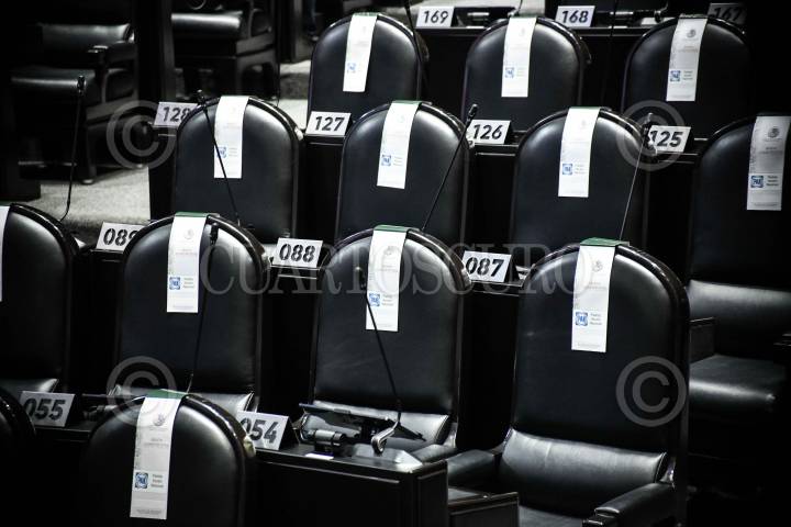 CIUDAD DE MÉXICO, 29SEPTIEMBRE2024.- Curules vacíos de legisladores del grupo parlamentario, durante sesión la ordinaria de la LXVI Legislatura de la Cámara de Diputados en la que se dio lectura a la declaratoria de publicidad al dictamen de reforma al Poder Judicial. FOTO: MARIO JASSO/CUARTOSCURO.COM