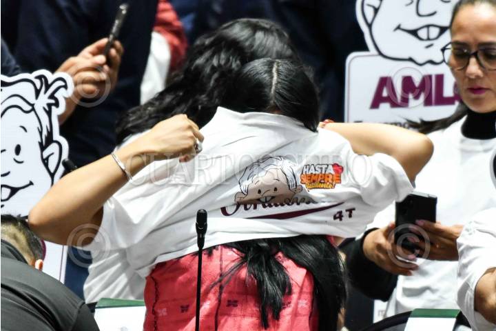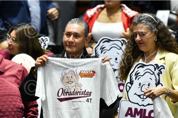 CIUDAD DE MÉXICO, 01SEPTIEMBRE2024.- Diputados de Morena muestran playeras y cartulinas con la caricatura de "AMLO (Andrés Manuel López Obrador, presidente de México), durante sesión ordinaria de la LXVI Legislatura de la Cámara de Diputados en la que se dio lectura a la declaratoria de publicidad al dictamen de reforma al Poder Judicial. FOTO: MARIO JASSO/CUARTOSCURO.COM