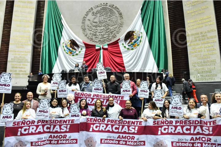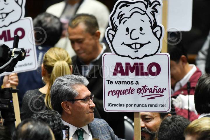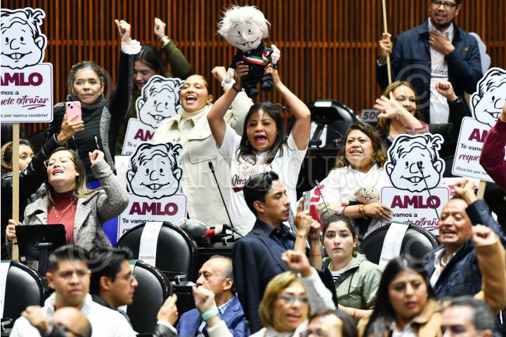 CIUDAD DE MÉXICO, 29SEPTIEMBRE2024.- Diputados del grupo parlamentario de Morena, festejan y muestran cartulinas con la frase "AMLO te vamos a requete extrañar" durante la sesión ordinaria de la LXVI Legislatura de la Cámara de Diputados en la que se dio lectura a la declaratoria de publicidad al dictamen de reforma al Poder Judicial. FOTO: MARIO JASSO/CUARTOSCURO.COM