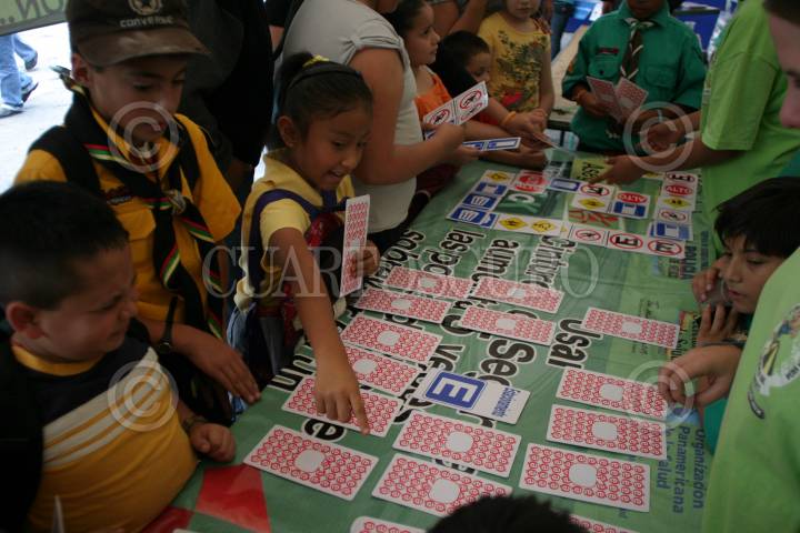 MÉXICO, D.F., 28AGOSTO2010.- Niños Scouts se divierten con los talleres de aprendisaje instalados en el Zócalo capitalino. La Asociación de Scouts de México, A.C., inició el día de hoy 28 de agosto de 2010, la recolecta de latas de aluminio para realizar la flor de lis más grande del mundo. FOTO: MISAEL VALTIERRA/CUARTOSCURO.COM