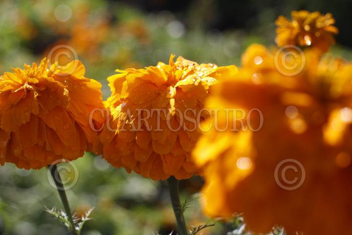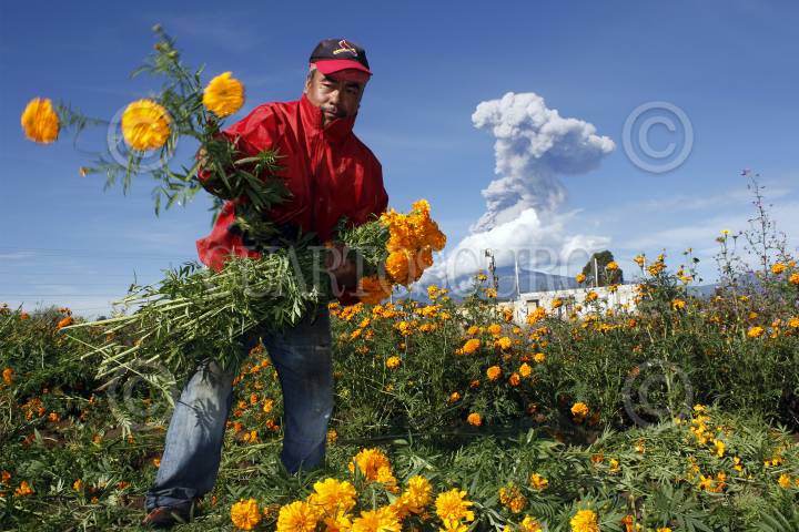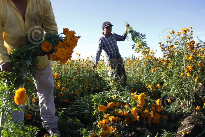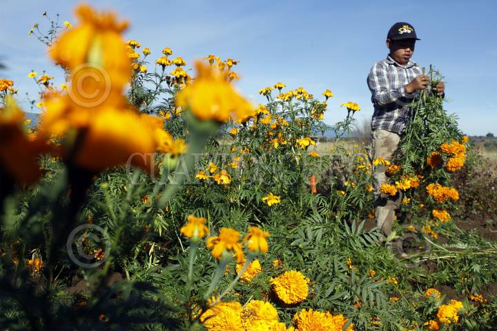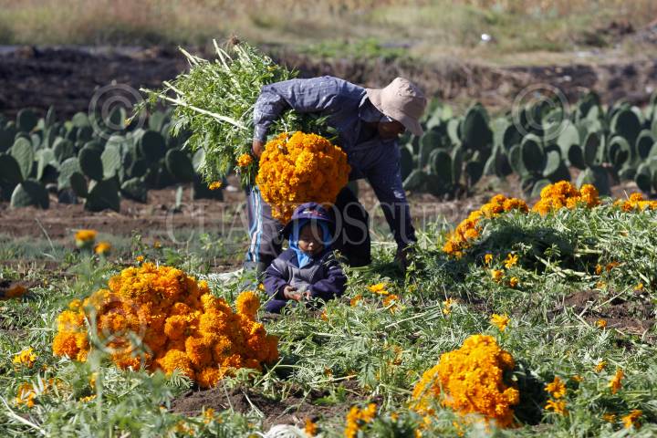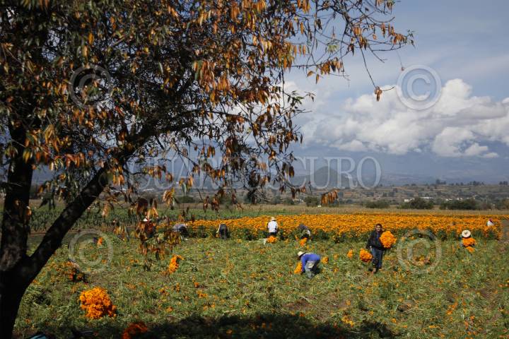 NEALTICAN, PUEBLA, 29OCTUBRE2015.- Tres generaciones de la familia López laboran en la corta de flor de cempasúchil, en un pequeño campo ubicado a las faldas del volcán Popocatépetl; con jornadas de 12 y hasta 16 horas de trabajo ininterrumpidas logran la recolección de la tradicional flor para transportarla y comercializarla en 15 pesos el ramillete en la central de abastos de la ciudad, donde es revendida en hasta el doble de precio. FOTO: HILDA RÍOS /CUARTOSCURO.COM