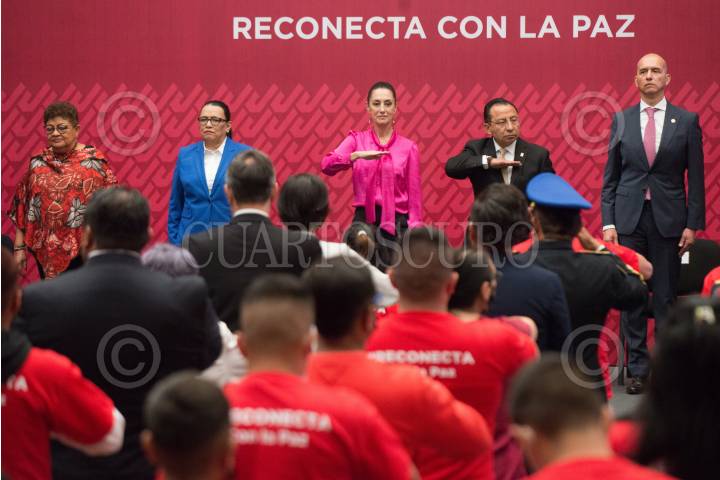 Ernestina Godoy Ramos, Fiscal General de Justicia de la Ciudad de México, Rosa Icela Rodríguez, secretaria de Seguridad y Protección Ciudadana del Gobierno de México; Claudia Sheinbaum Pardo, jefa de Gobierno, y Rafael Guerra Álvarez, magistrado Presidente del Poder Judicial de la Ciudad de México, durante la Segunda Ceremonia de Entrega de Reconocimientos a Personas Beneficiarias de la “Estrategia Reconecta con La Paz”.