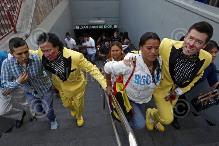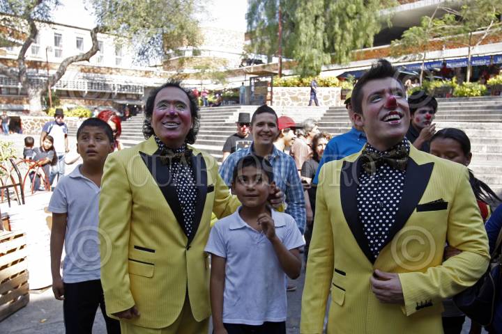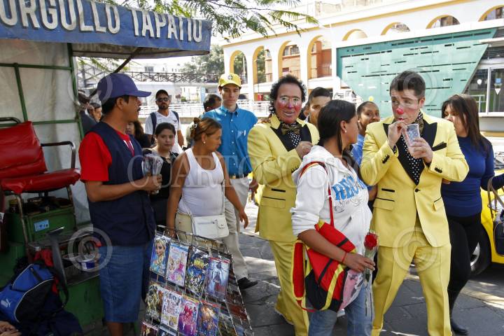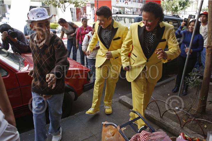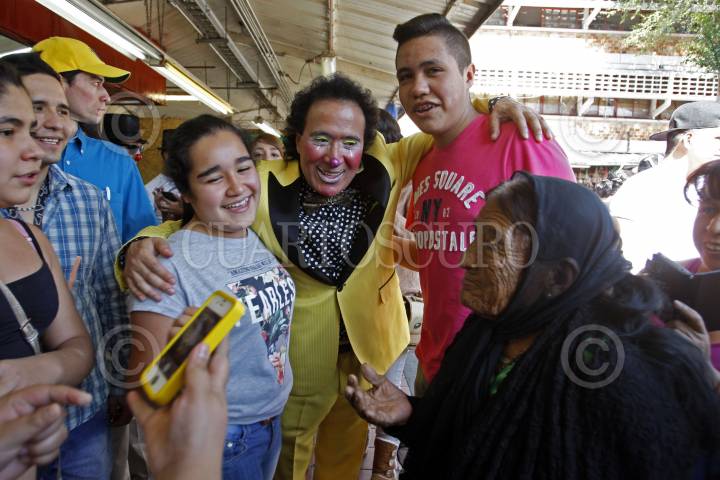 GUADALAJARA, JALISCO. 20ENERO2015.- Después de haber simulado un mitin político en Plaza Universidad, Guillermo Cienfuegos Pérez el Payaso “Lagrimita” y su hijo Costel, realizaron un recorrido por el Mercado San Juan de Dios y sus inmediaciones para tratar de recolectar 23 mil firmas y aspirar como candidato independiente a la Presidencia Municipal de Guadalajara. FOTO: FERNANDO CARRANZA GARCIA / CUARTOSCURO.COM