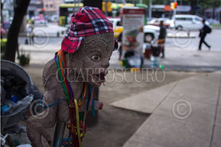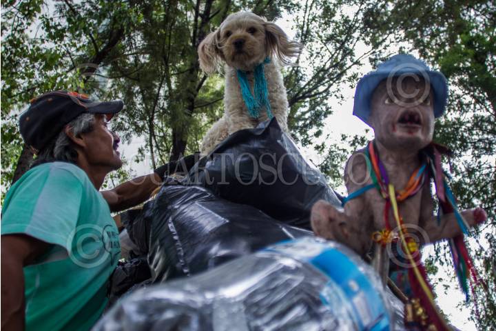 MÉXICO, D.F., 15JUNIO2015.- Un señor mejor conocido como El "Pelucas", recorre las calles de la zona centro de la ciudad por las noches para recolectar artículos reciclables y que aun se puedan vender de la basura que se acumula en las calles para así poder sobrevivir. El "Pelucas" junto a su perro que recogió en un basurero y un muñeco que lo apodo como el, son sus únicos compañeros mismos que cuidan las bolsas recolectadas cuando este se va a tomar por la mañana con amigos que conoce. FOTO: ENRIQUE ORDÓÑEZ /CUARTOSCURO.COM