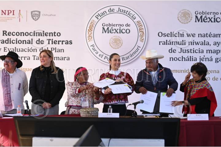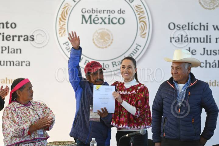 MOGÓVATO, URIPE, CHIHUAHUA, 20DICIEMBRE2024.- Claudia Sheinbaum Pardo, presidenta de México, encabezó la firma de Decretos de Reconocimiento de Propiedad Comunal tradicional de Tierras a Comunidades Rarámuri, así cómo la Evaluación del Plan de Justicia de los Pueblos de la Sierra Tarahumara. FOTO: PRESIDENCIA/CUARTOSCURO.COM