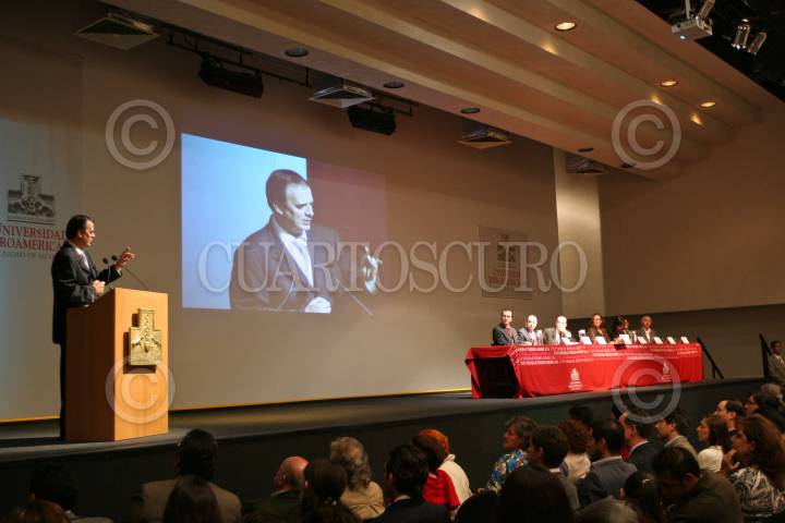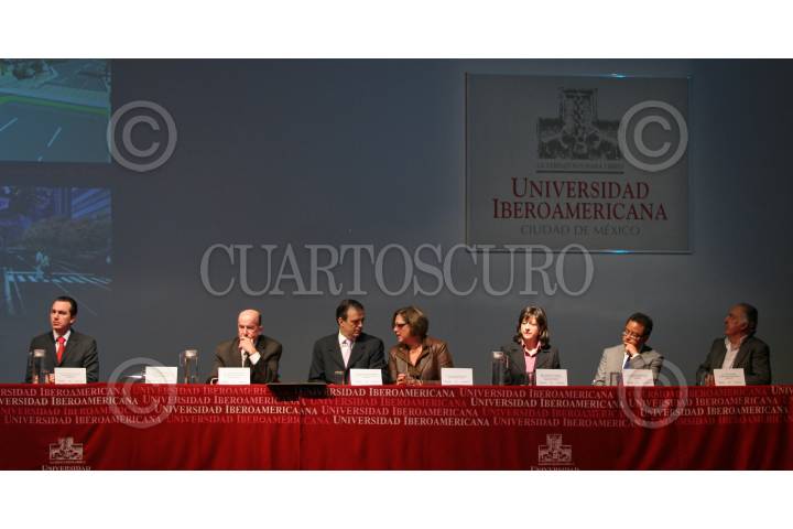 MÉXICO, D.F., 03SEPTIEMBRE2010.- Carlos Orvañanos Rea, Jefe delegacional en Cuajimalpa; José Morales Orozco, Rector de la Universidad Iberoamericana; Marcelo Ebrard Casaubon, Jefe de Gobierno del Distrito Federal; Elena Cepeda, Secretaria de Cultura del DF; Gabriela Lee Alardín, Coordinadora de la Mestría de Proyectos para el Desarrollo Urbano y Eduardo Santillan, Jefe delegacional en Álvaro Obregón; durante una charla a medios de comunicación, estudiantes y profesores en la Universidad Iberoamericana previo a la inauguración del Corredor Santa Fé. Hoy viernes 3 de septiembre de 2010. FOTO: MISAEL VALTIERRA/CUARTOSCURO.COM