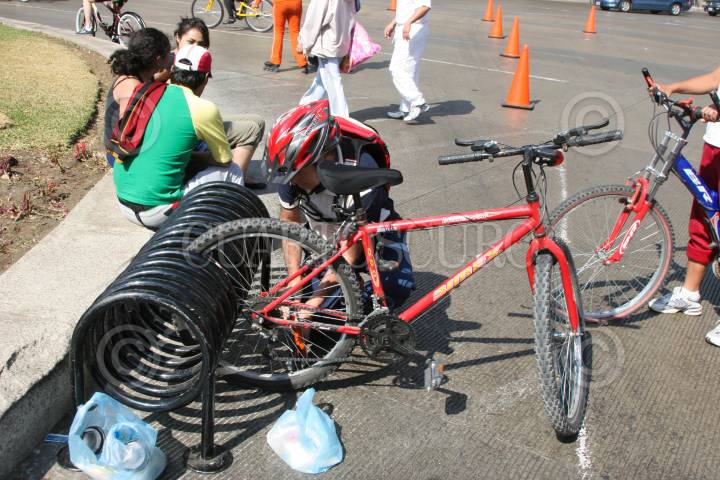 MÉXICO, D.F., 11ENERO2009.- Cientos de personas acuden a la Avenida Paseo de la Reforma para salir con su bicicleta y ejercitarse, durante el programa denominado Ciclotón. En la imagen un una persona asegura su bicicleta a uno de los estacionamientos de bicis ubicados a lo largo del recorrido. FOTO: RICARDO CASTELAN/CUARTOSCURO.COM