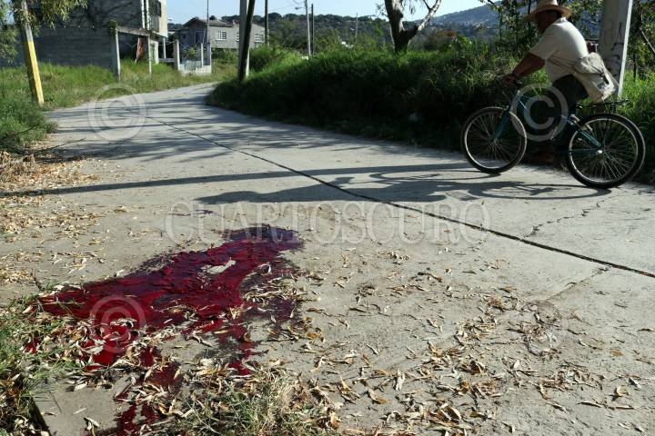 JIUTEPEC. MORELOS, 11NOVIEMBRE2018.- Un campesino en bicicleta paso por el sitio donde dos hombres fueron ejecutados durante la madrugada de este día en la calle Sauces de la colonia Ampliación Las Fuentes. Las víctimas tenían las manos y los pies atados, estaban amordazados y de una edad aproximada de 30 años. Uno vestía pantalón de mezclilla y playera roja, y el otro pants y sudadera gris. En otro hecho violento cuatro personas murieron en el sur del estado, en el poblado de Coahuixtla en Amacuzac, donde hombres que viajaban en motocicletas dispararon contra los clientes de un billar. FOTO: MARGARITO PÉREZ RETANA /CUARTOSCURO.COM