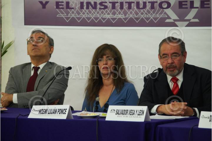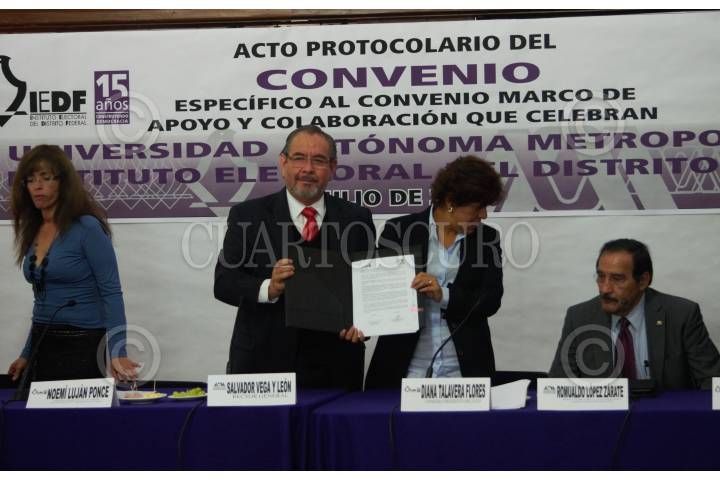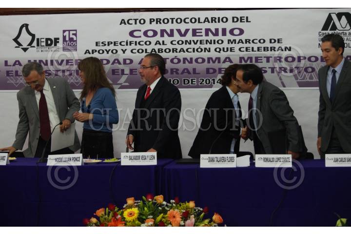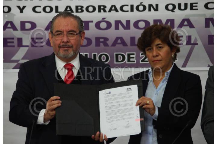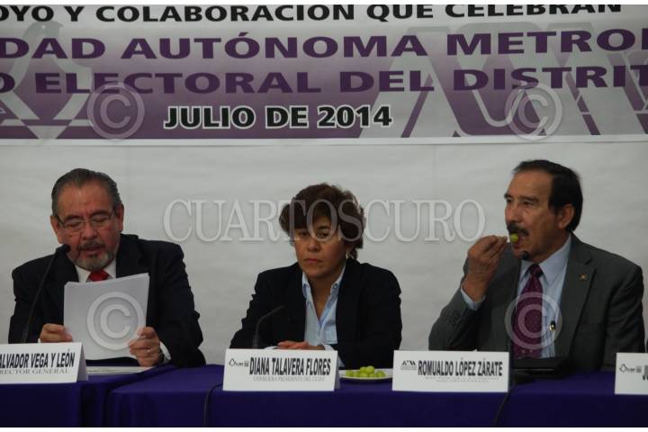 MÉXICO,D.F.,09JULIO2014.- El rector de la Universidad Autónoma Metropolitana, Salvador Vega y León, y la consejera presidente del Instituto Electoral del Distrito Federal (IEDF), Diana Talavera Flores, firmaron un convenio de colaboración entre las dos instituciones para el desarrollo de una aplicación que permita hacer más eficaz el proceso de cómputo de los votos de los futuros comicios locales. La firma se llevó a cabo en las instalaciones del IEDF al sur de la ciudad. FOTO: MARÍA JOSÉ MARTÍNEZ /CUARTOSCURO.COM