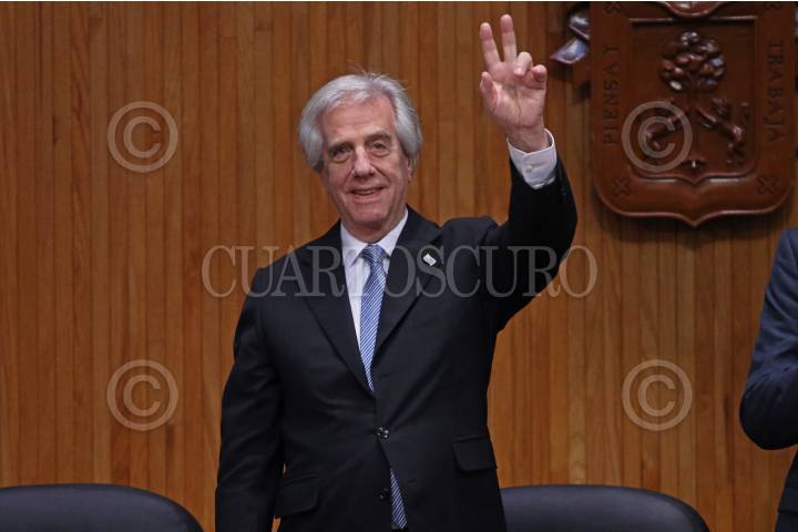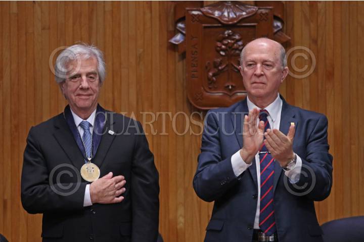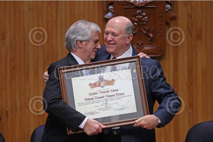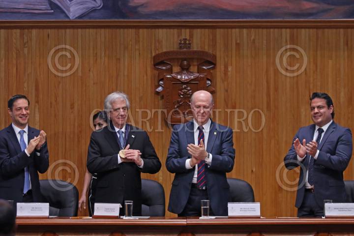 GUADALAJARA, JALISCO, 25JULIO2018.- Tabaré Ramón Vázquez Rosas Presidente de la Republica Oriental de Uruguay, fue homenajeado con el título Doctor Honoris Causa por la Universidad de Guadalajara (UdeG), esto por sus contribuciones a la vida democrática de américa latina y su lucha social, también dicha casa de estudios resalto su trayectoria como médico, académico y estadista, la ceremonia tuvo lugar en el Paraninfo Enrique Díaz de León de la UdeG y fue encabezada por el Rector General Miguel Ángel Navarro Navarro así como del Gobernador del estado, Jorge Aristóteles Sandoval Díaz. FOTO: FERNANDO CARRANZA GARCIA / CUARTOSCURO.COM