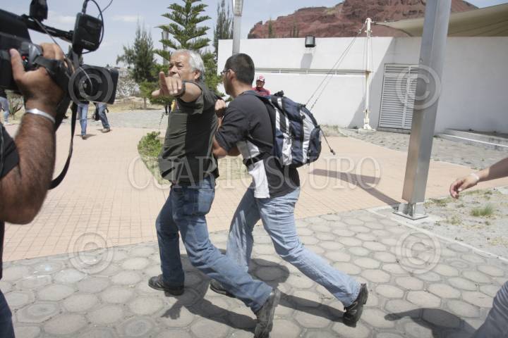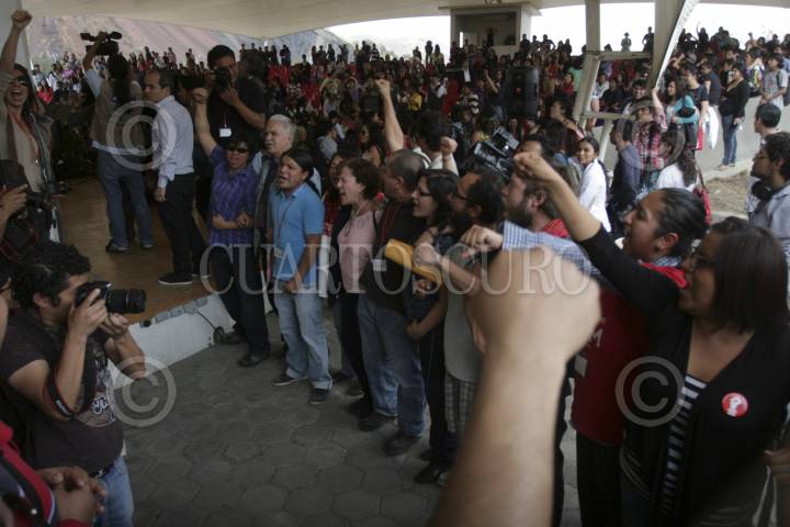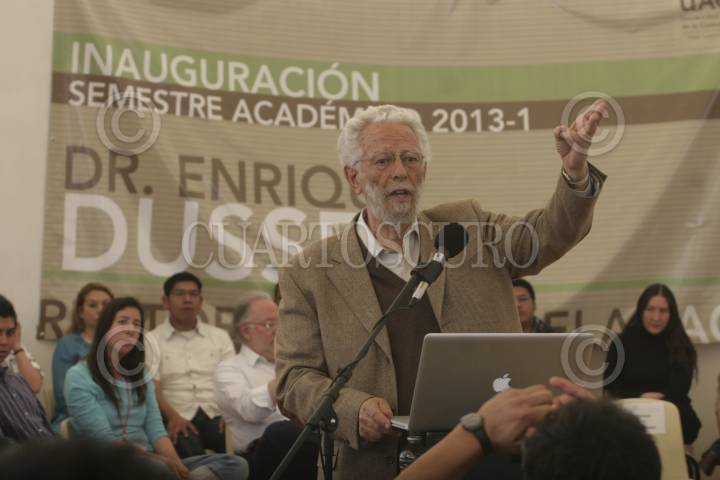 MÉXICO, D.F., 12MARZO2013.-El Rector Interino de la Universidad Autónoma de la Ciudad de México (UACM), Doctor Enrique Dussel, se presentó en el auditorio denominado "El Ágora" en donde inaguró el semestre 2013-1. Ahí alrededor de 10 personas, simpatizantes de Esther Orozco, irrumpieron con pancartas y gritando consignas en contra del recien nombrado encargado interino de la Rectoría. Acto seguido varios asistentes al acto los sacaron entre empujones y gritos a favor. FOTO: JUAN PABLO ZAMORA /CUARTOSCURO.COM