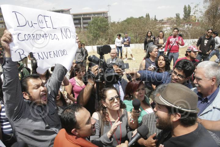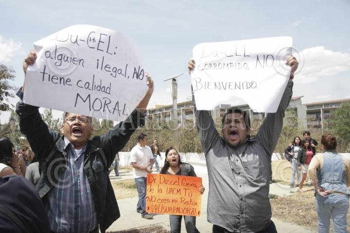 MÉXICO, D.F., 12MARZO2013.- Alrededor de 10 personas, simpatizantes de Esther Orozco, irrumpieron con pancartas y gritando consignas en contra del recien nombrado encargado interino de la Rectoría de la Universidad Autónoma de la Ciudad de México (UACM), Enrique Dussel, quien se se presentó en el auditorio denominado "El Ágora" de San Lorenzo Tezonco, Tlahuac. Ahí se inaguró el semestre 2013-1. Los manifestantes fueron sacados entre empujones y gritos a favor y en contra de ambos grupos.. FOTO: JUAN PABLO ZAMORA /CUARTOSCURO.COM