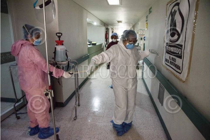 Personal médico del Hospital General de Atizapán "Dr. Salvador Gónzalez Herrejón realiza procedimientos de sanitización en el pasillo de atención a pacientes con covid-19.