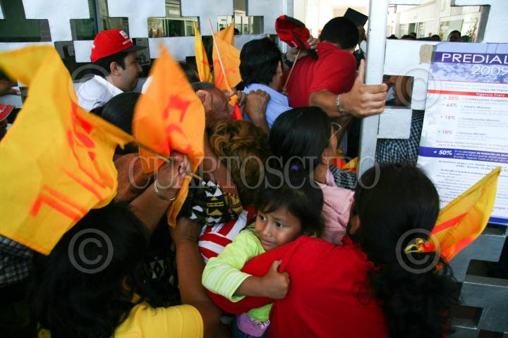 VILLAHERMOSA, TABASCO, 06FEBRERO2009.- Manifestantes que se plantaron en puertas de Palacio Municipal que no fueron atendidos por las autoridades entran a empujones y golpes, enfrentándose con miembros de logística y exigir la regularización de sus predios en las colonias de Río Nuevo y Buena Vista primera sección en donde habitan en promedio cuatrocientas familias de bajo recursos. FOTO: MARCO POLO GUZMÁN HERNÁNDEZ/CUARTOSCURO.COM