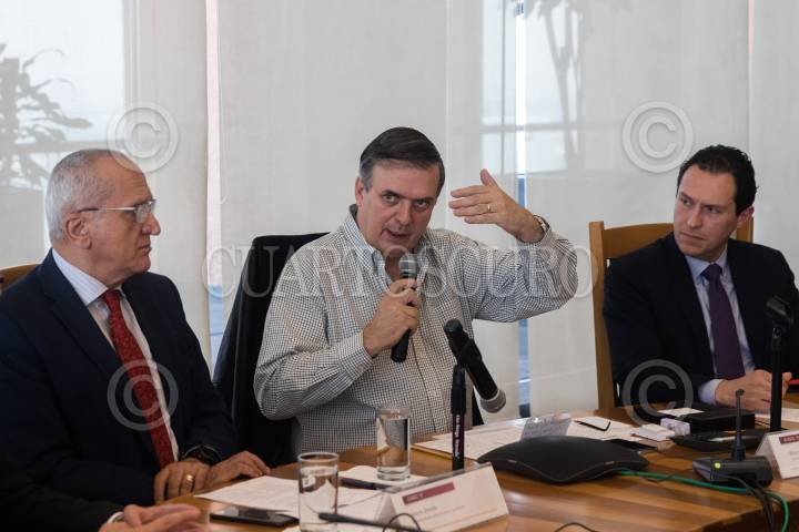 CIUDAD DE MÉXICO, 14JULIO2019.- Marcelo Ebrard Casaubón, secretario de Relaciones Exteriores; Jesús Seade, subsecretario para América del Norte, y Alejandro Celorio, consejero jurídico de la SRE, ofrecieron una conferencia de prensa para hablar sobre la amenaza de Donald Trump de iniciar redadas en contra de mexicanos que viven de manera ilegal en los Estados Unidos, al momento señalan que 1807 connacionales tienen orden de deportación definitiva, detallaron el plan para darles asesoría jurídica y que puedan resolver sus pendientes en aquella nación, precisaron que aunque aún no inician las redadas la cancillería ya está preparada para dar la batalla legal en la protección de los derechos de los mexicanos. FOTO: MOISÉS PABLO /CUARTOSCURO.COM