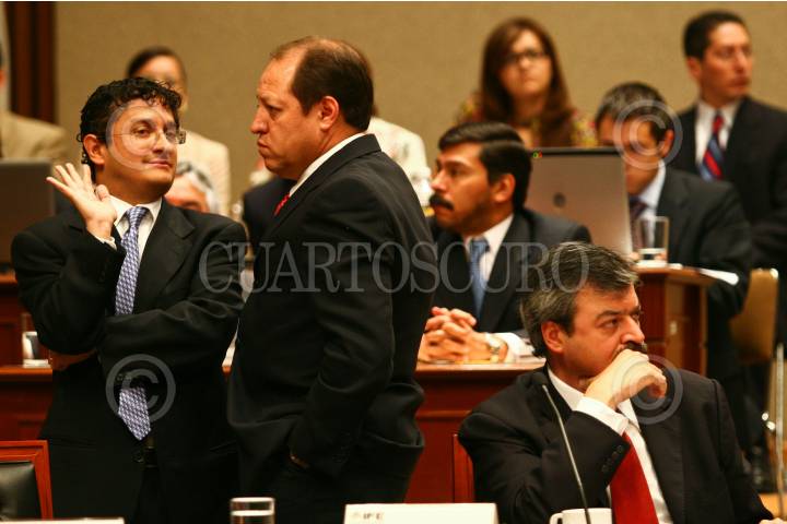 MÉXICO, D.F., 18JUNIO2008.- Los consejeros Virgilio Andrade Martínez, Marco Antonio Baños y Andrés Albo Márquez, durante la sesión de dicho Instituto, donde se determino una sanción de 894 mil 30 pesos al PRD, por violar el Cofipe al usar la frase "presidente legítimo" en referencia a Andrés Manuel López Obrador. FOTO: ISAAC ESQUIVEL/CUARTOSCURO.COM