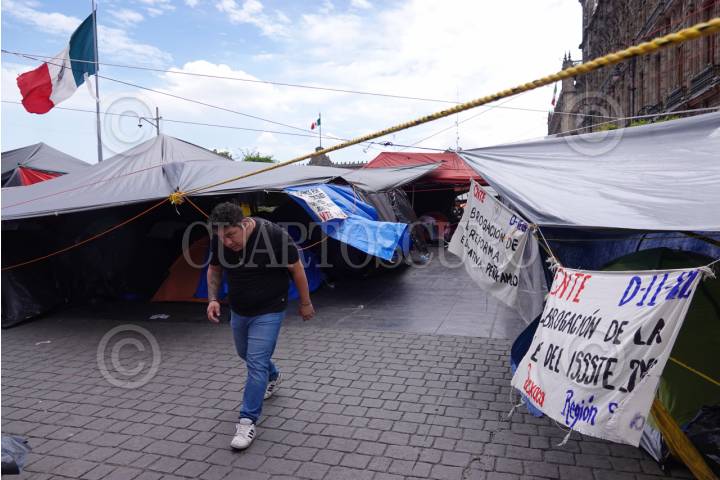 CIUDAD DE MÉXICO, 28MAYO2025.- Maestros de la Coordinadora Nacional de Trabajadores de la Educación (CNTE) se mantienen en plantón en el Zócalo capitalino en donde exigen atención a sus demandas como la abrogación de la aprocación a la Ley del ISSSTE del 2007 y las Reformas Educativa y laboral. Se estima que esta tarde haya nuevas respuestas por parte de la Secretaría de Gobernación en una reunión con los dirigentes de la CNTE. FOTO: GRACIELA LÓPEZ/CUARTOSCURO.COM