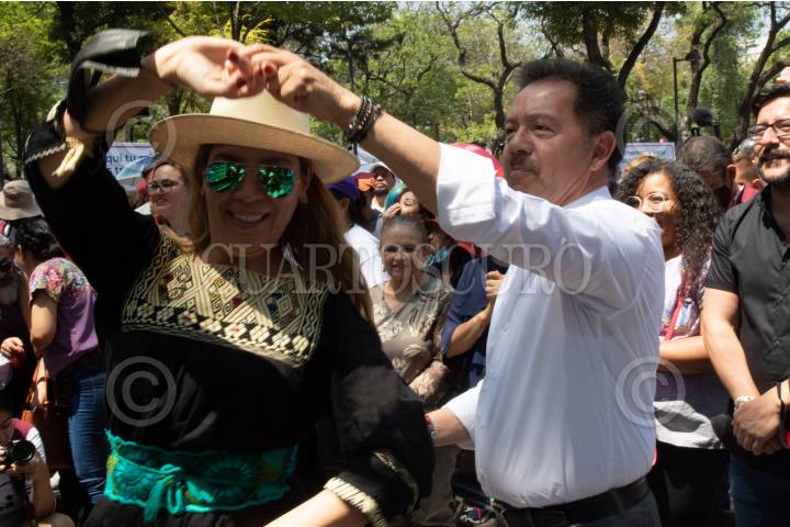 Citlalli Hernández, Mario Delgado, y Marisol Segura García, durante el Festival por la Soberanía Nacional, en la Alameda Central.