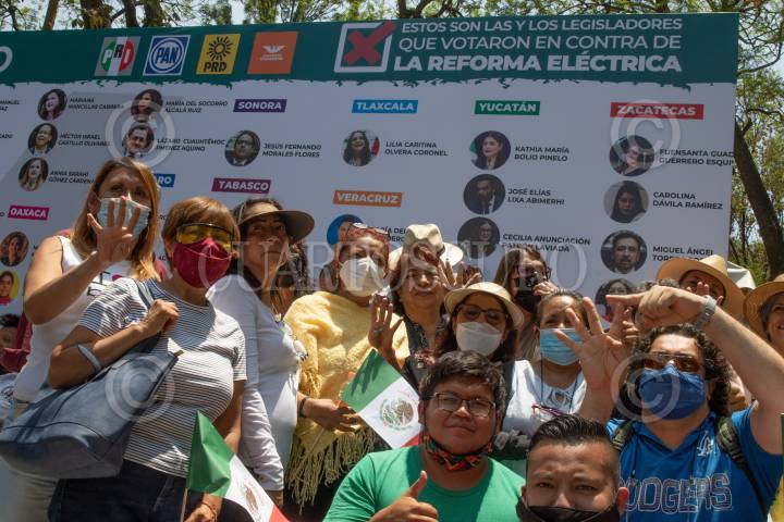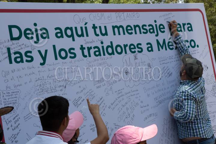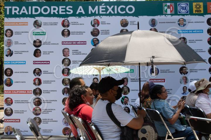 Una mampara con la leyenda "traidores a México" y las fotos de los diputados que votaron en contra de la Reforma Eléctrica, impulsada por el Jefe del Ejecutivo, durante el Festival por la Soberanía Nacional.