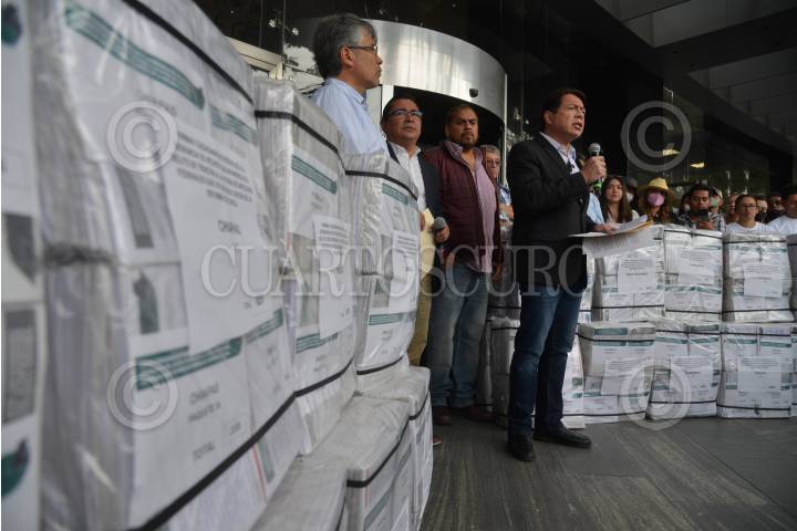 Mario Delgado, dirigente nacional de Morena, acudió a la Fiscalía General de la República a entregar decenas de paquetes con firmas recaudadas de ciudadanos en respaldo a la denuncia de hechos "con apariencia del delito de traición a la patria de diputados federales que votaron en contra de la reforma eléctrica".