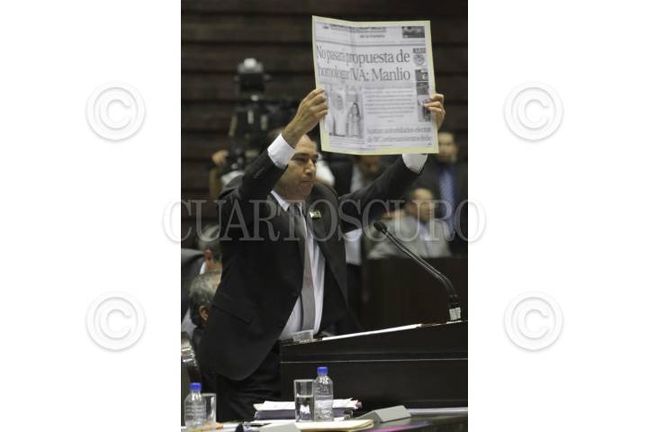 MÉXICO, D.F., 17OCTUBRE2013.- Andrés de la Rosa, diputados del PAN, le muestra un recorte de un diario con donde hace mención de una declaración del diputado del PRI, Manlio Fabio Beltrones, durante la sesión en la cámara de diputados donde se voto en lo general la Reforma Hacendaria. FOTO: GUILLERMO PEREA /CUARTOSCURO.COM
