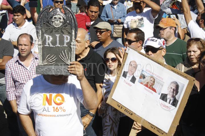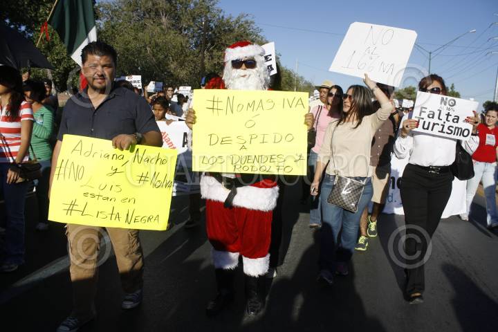 CIUDAD JUÁREZ, CHIHUAHUA, 19OCTUBRE2013.- Esta tarde se realizó marcha de juarenses y empresarios en contra del aumento al IVA en la frontera, partieron de la avenida Heroico Colegio Militar y culminará en el Puente Libre. Esta marcha la convocaron principalmente la Asociación de Maquiladoras y las diferentes cámaras empresariales de la localidad. Entre los asistentes se encuentras políticos, empresarios y ciudadanos, como Manuel Sotelo, líder transportista; el ex gobernador, Francisco Barrio; la presidenta de la AMAC, Claudia Troitiño; la ex diputada, María Antonieta Pérez, entre otros.El punto de reunión y también de donde partieron fue la Plaza de la Mexicanidad, ahí llegaron cientos de ciudadanos juarenses que también están en contra del aumento al IVA. Tras partir de la Plaza de la "X" siguieron por la Heroico Colegio Militar hasta la avenida de Las Américas para finalizar en el Puente Libre. FOTO: NACHO RUÍZ /CUARTOSCURO.COM