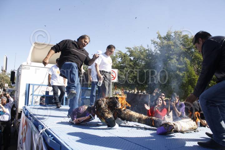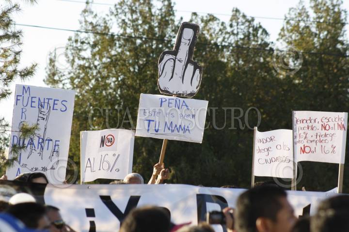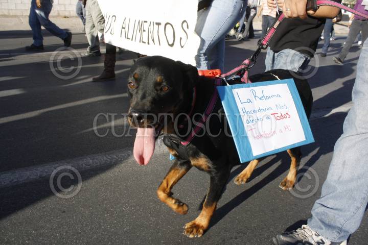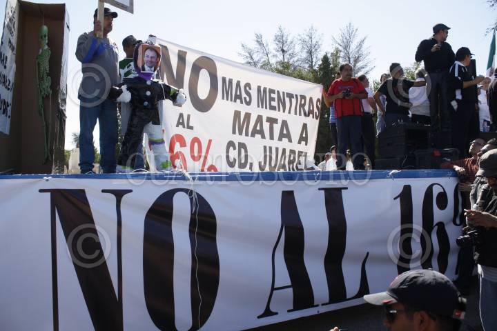 CIUDAD JUÁREZ, CHIHUAHUA, 22OCTUBRE2013.- Cientos de trabajadores de la industria maquiladora, del sector comercial, así como miembros de la ciudadanía en general se dieron cita esta tarde en la Plaza de la Mexicanidad para marchar hasta el Puente Santa Fe para protestar por la homologación del IVA en las fronteras, iniciativa incluida en la Reforma Hacendaría propuesta por el presidente Enrique Peña Nieto y aprobada por la Cámara de Diputados. FOTO: NACHO RUÍZ /CUARTOSCURO.COM